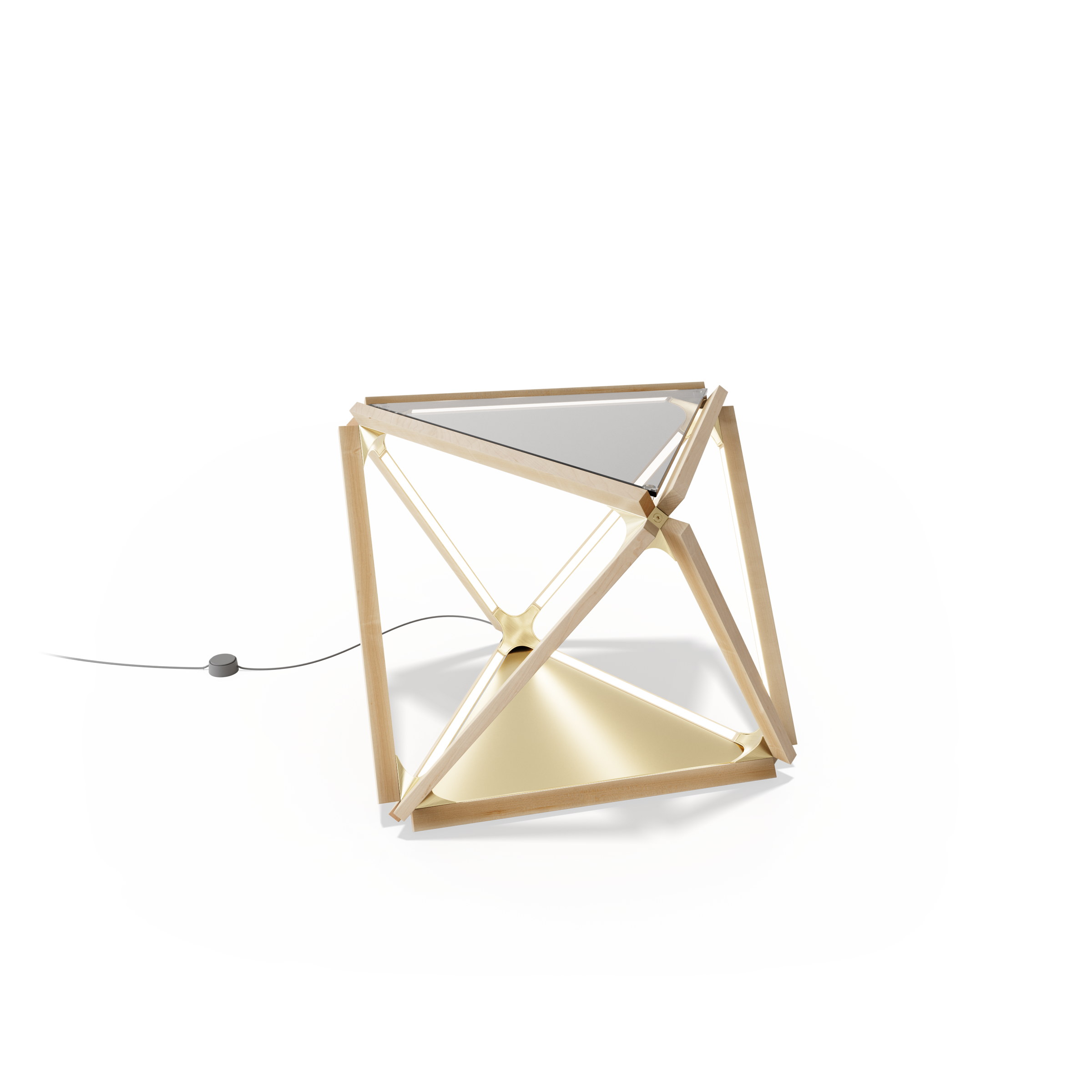 The Diamond Table is comprised of 6 solid wood sticks held in place by sculptural brass connectors. It casts warm light in all directions, evokes a classic crystalline geometry, and is often used as side-tables in living rooms or bedrooms.