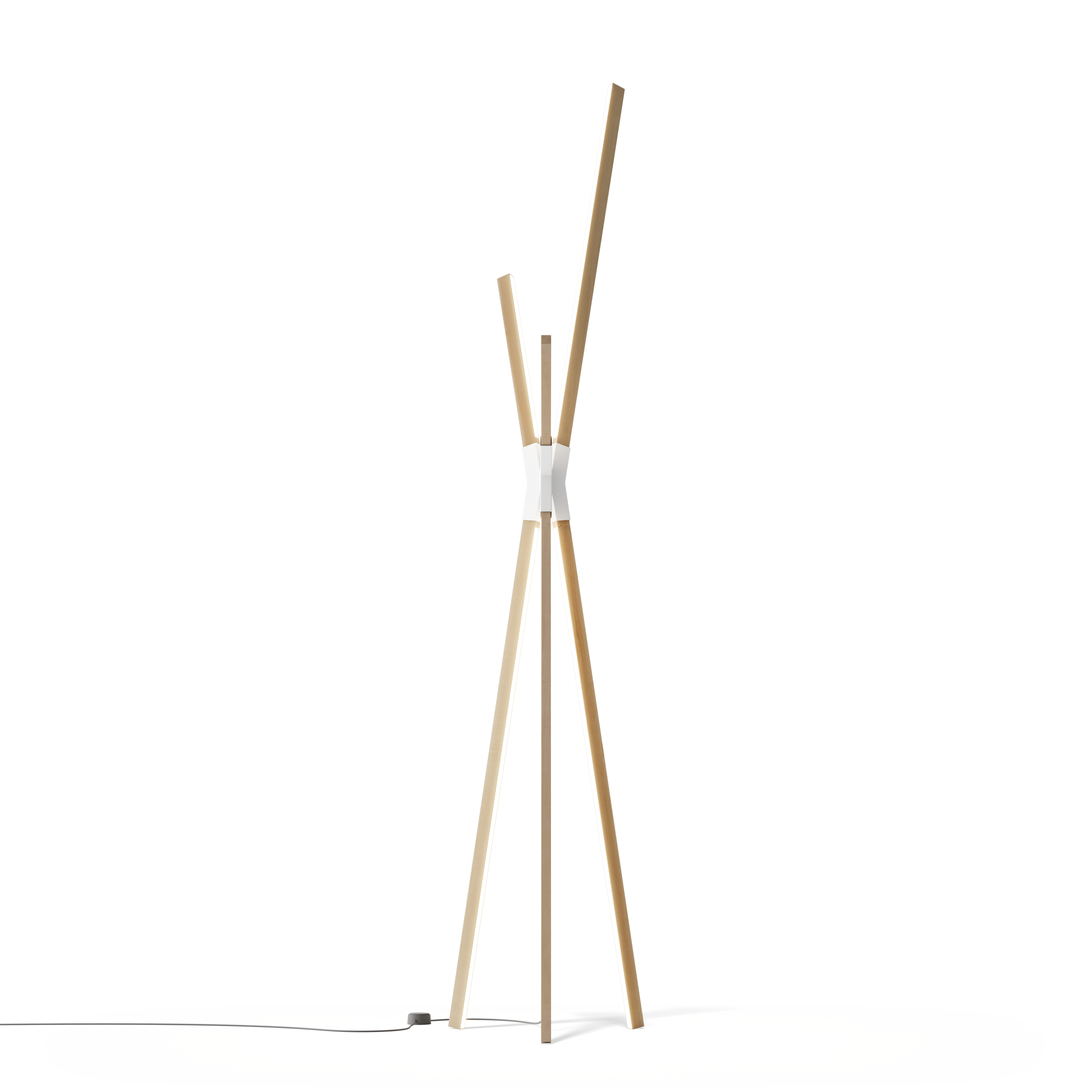 FLOOR BANG is comprised of 6 solid wood sticks of varying lengths held in place by a central steel socket.