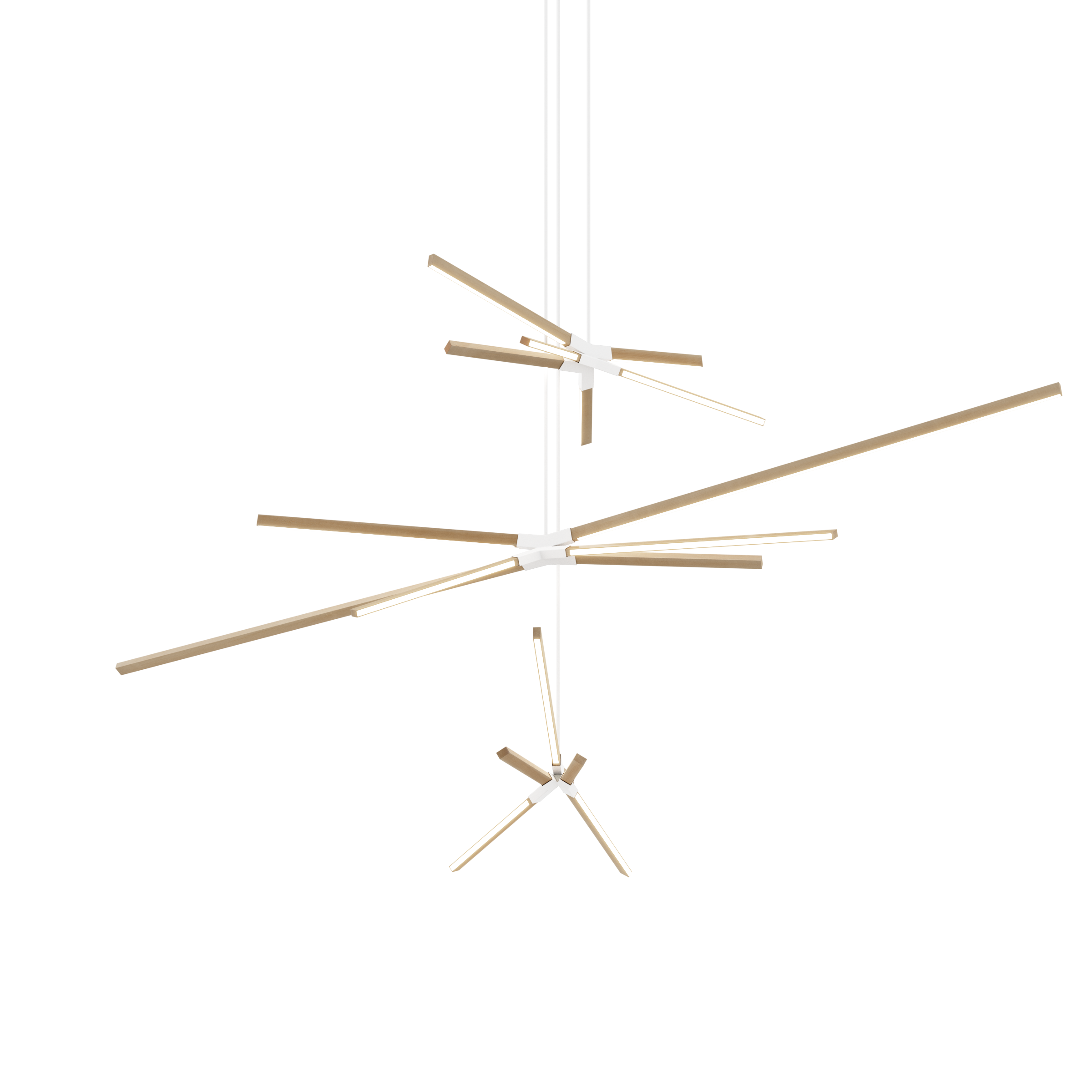 MULTIPLE SKYBANG is comprised of 18 solid wood sticks of varying lengths held in place by 3 central steel socket and stems.