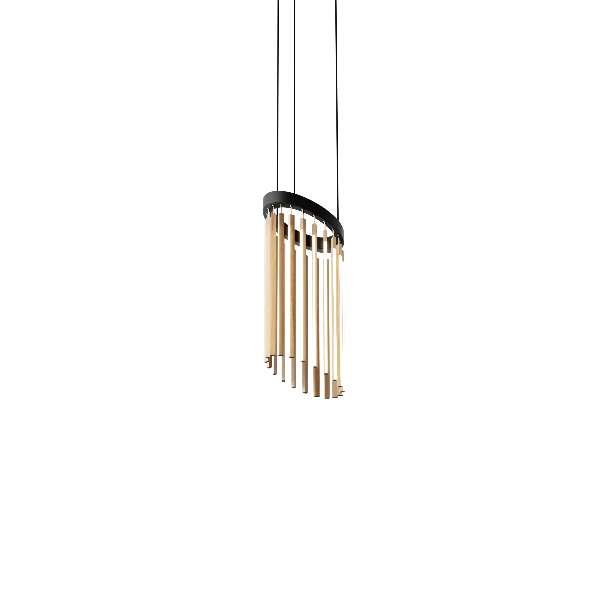 CHIME is comprised of between 20 to 36 solid wood sticks hanging by brass hardware from a slumped steel ring. It casts warm light in all directions, is at once curvaceous and linear, and is commonly used alone, in clusters, or in a double or triple cascade configurations. Customization available upon request.